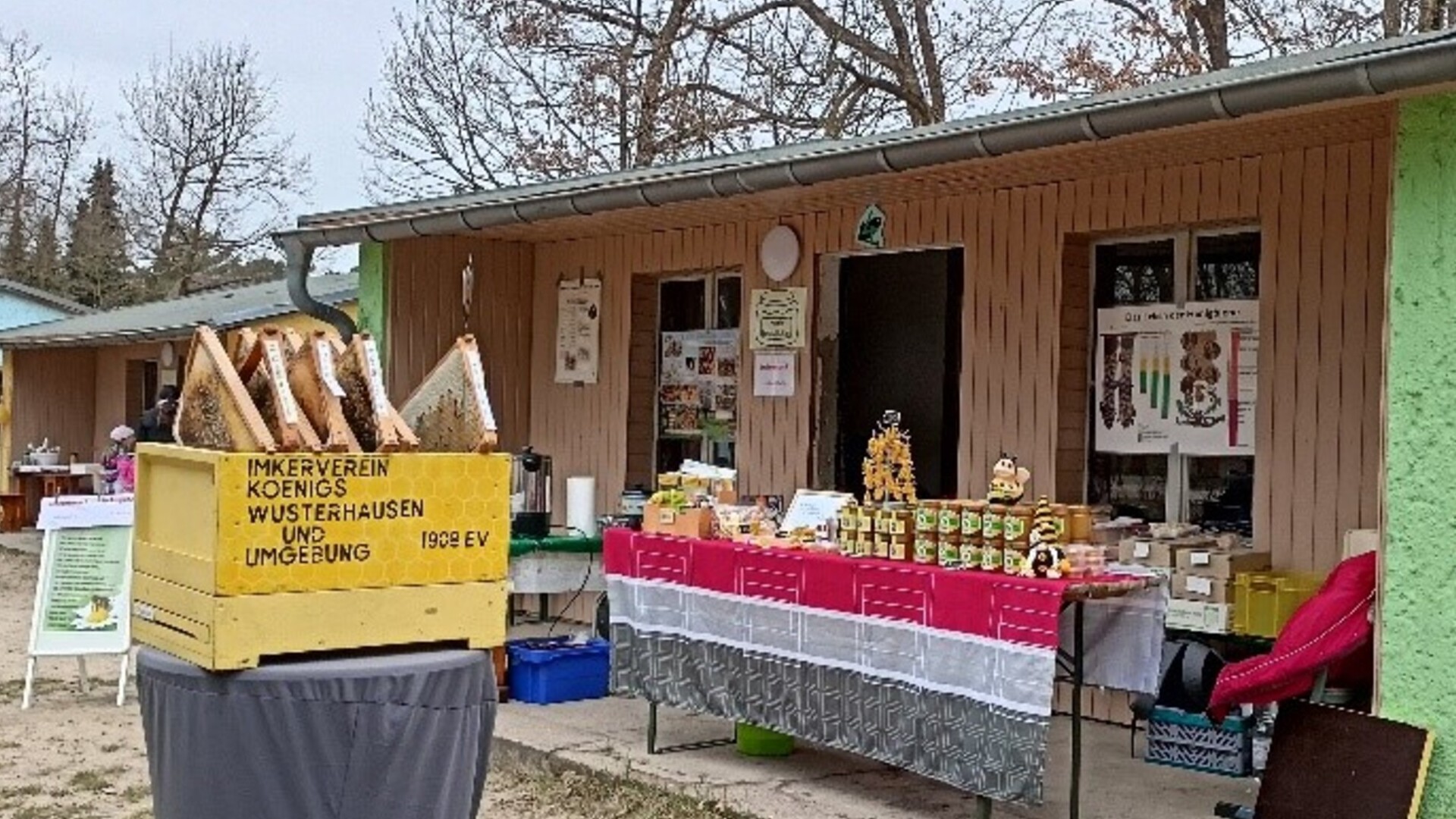 Am Samstag, 12 April 2025 war es wieder so weit. Die Farben der Natur ließen noch zu wünschen übrig, die Sonne wärmte nur vorsichtig aber unsere Imkerinnen Gerhilt Dehnst und Britta Hofmann gestalteten einen farbenfrohen und informativen Verkaufsstand für die Besucher im Kinder – und Erholungszentrum am Hölzernen See bei Gräbendorf. Sie waren schon oft dort an den Unterhaltungsprogrammen der Betreiber beteiligt so auch diesmal. Mit den Rähmchen der Fotobeute lies sich das Leben in einem Bienenvolk gut veranschaulichen. Selbstredend war die Suche nach der Königin erfolgreich, Aufgaben der Arbeiterinnen wie Pflege -, Bau – und Wächterdienste, sowie Blüten bestäuben und Honig machen erörtert. Die Schönheit der Drohnen wurde dargestellt und die Kinder konnten eigene Teelichter aus Bienenwachs gießen. Honige aus der Region in unterschiedlichen Geschmacksrichtungen fanden ebenso Kunden, wie Produkte, die unter Verwendung von Bienenwachs oder Propolis hergestellt wurden. So wurde es für alle Besucher und Beteiligte ein gelungener Tag, der die Aufmerksamkeit auf die Bedeutung unseres Hobbys als Imker wie nebenbei lenkte.